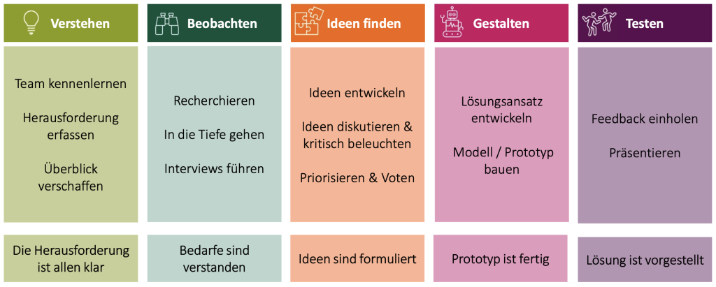 Der Ablauf eines Hackathons besteht aus fünf Phasen, welche die Teams gemeinsam Schritt für Schritt durchlaufen. Ziel ist es, am Ende für eine konkrete Herausforderung eine Lösung in Form eines Prototypen oder Modells zu entwickeln.
