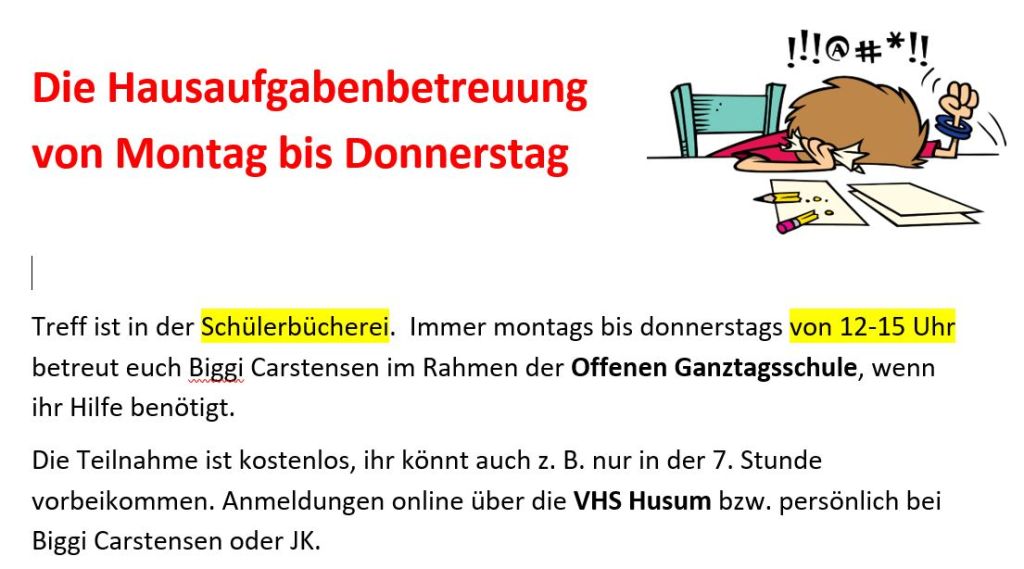 In Zusammenarbeit mit allen weiterführenden Schulen unserer Stadt organisiert die VHS Husum die Offene Ganztagsschule. Damit ist es einfacher möglich, auch schulübergreifende AGs zu besuchen. Die VHS stellt für den Husumer Ganztagsschulbetrieb viele Informationen bereit.