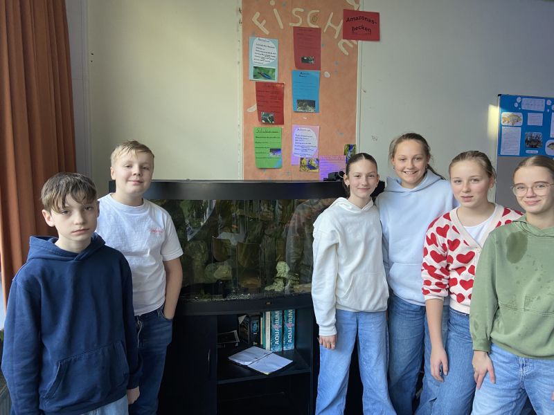 Vor vielen Jahren haben wir ein 350l-Aquarium gestiftet bekommen. Dies ist heute unser Amazonasbecken (26 Grad) mit vielen bunten Fischen: von Neonsalmlern über Riesengarnelen bis zu verschiedenen Platys. Auch Welse, wie Antennen- und Panzerwelse sind darunter. Schüler und Schülerinnen der AG kümmern sich seither liebevoll um die Tiere.